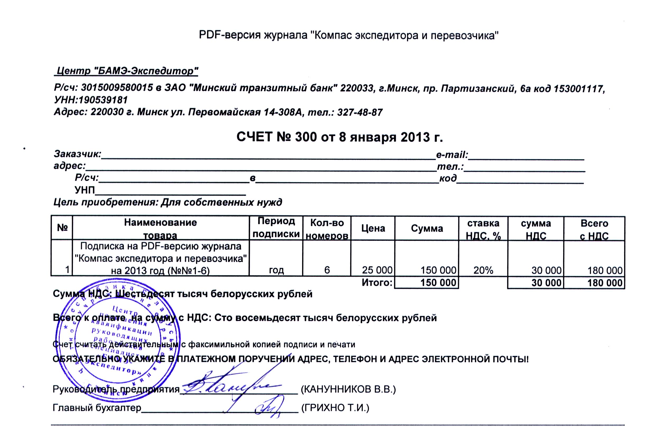 Подписку на печатную версию журнала «Компас экспедитора и перевозчика» на 2013 г. можно оформить через редакцию, скачав с сайта счет-фактуру и оплатив по ней 360 тыс. руб. (в т.ч. НДС 20%). Журнал будет поступать почтовой рассылкой на указанный в платежном поручении адрес.